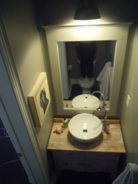 I must say before moving in I did not have a plan for this room. I thought I was going with a coral colour but that was about it , oh wait , I knew what light I wanted and I stuck with that . I knew I didn't want the simple pedestal sink ( we can use that in the roughed in basement bath one day) but when we were working on the diagonal floor install it occurred to me the small dresser without a home in the house might just be perfect , and luckily for me it was.