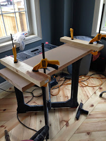 I decided to make the thicker shelves out of 2 pieces of mdf simply glued together...I just clamped them and let them sit for 20 -30 min and then installed them using clamps to help me place and level
