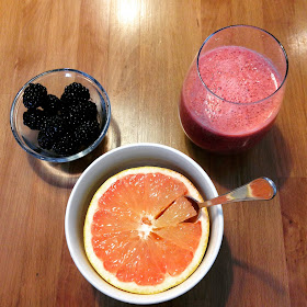 Another great breakfast with my perfect smoothie, 2 oranges freshly sqeezed, 1/2 cup frozen dark cherries and 4-6 fresh strawberrie...blend and enjoy
