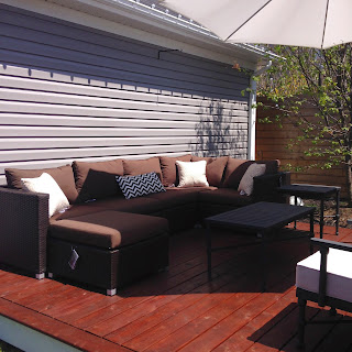 We had set up the settee and chairs we bought last year and I realized we weren't utilizing very much of this deck, so much was just wasted space. We had planned or I had planned for this deck to be a sun deck since it is the sunniest spot in the yard but we realized this is our main entertaining area because it is sunny and it is also private and we are drawn to this spot....I thought we should really maximize our seating so I ordered this sectional from Sears...I love it...it is very flexible and very confortable and now we can seat 8 comfortably...we just need some more warm weather so we can enjoy it again. We plan to run a gas line out to this deck for a fire bowl/pit that we will install here when we complete our backyard.